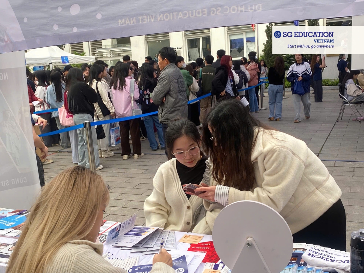 Ngay từ sáng sớm, booth của SG Education Việt Nam đã đón tiếp hàng trăm học sinh và phụ huynh đến tư vấn. Rất nhiều câu hỏi liên quan đến lộ trình du học tại Canterbury Christ Church University, từ các bạn học sinh mong muốn săn học bổng, đến những bạn tìm kiếm môi trường giáo dục tiên tiến để phát triển toàn diện. Đội ngũ tư vấn đã tận tình giải đáp, giúp các em hiểu rõ hơn về các lựa chọn phù hợp với năng lực và nguyện vọng cá nhân.