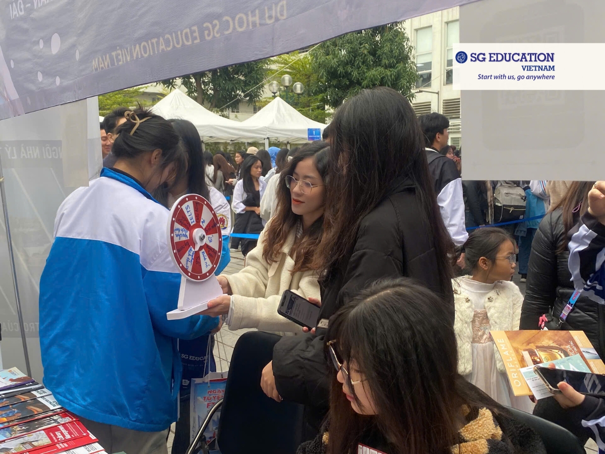 Không chỉ dừng lại ở tư vấn chuyên sâu, booth của SG Education Việt Nam còn mang đến nhiều hoạt động tương tác thú vị. Một trong những điểm nhấn tại booth là minigame trắc nghiệm kiến thức du học, thu hút sự tham gia sôi nổi của nhiều bạn trẻ. Những câu hỏi xoay quanh các nền giáo dục quốc tế, văn hóa du học và kinh nghiệm chuẩn bị hồ sơ đã mang đến không khí hào hứng và giúp các bạn mở rộng hiểu biết về hành trình du học.
