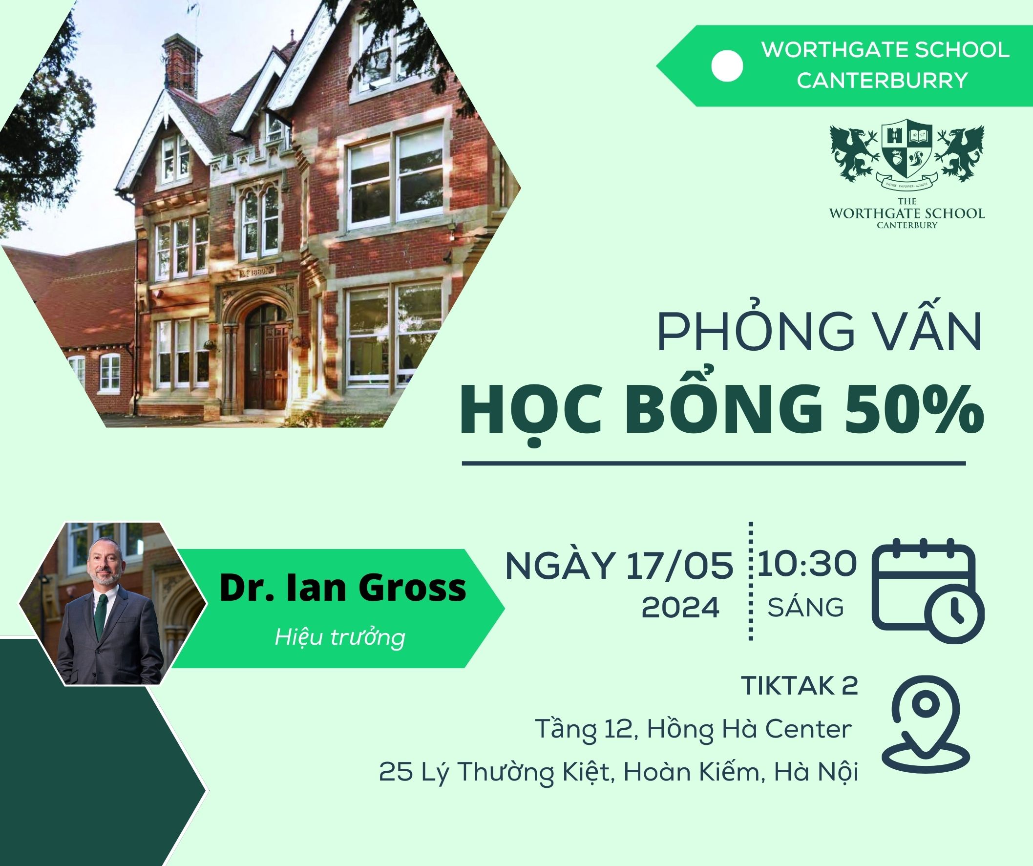 Buổi trao phỏng vấn sẽ do thầy Ian Gross - hiệu trưởng của trường điều hành tại TikTak 2, Tầng 12, Hồng Hà Center, 25 Lý Thường Kiệt, Hoàn Kiếm, Hà Nội. Với tư cách là Hiệu trưởng và cũng là phụ huynh có con đang học tại trường, thầy Ian Gross không chỉ là người lãnh đạo tận tâm mà còn là người đồng hành đầy nhiệt huyết cho sự phát triển của mỗi học sinh.