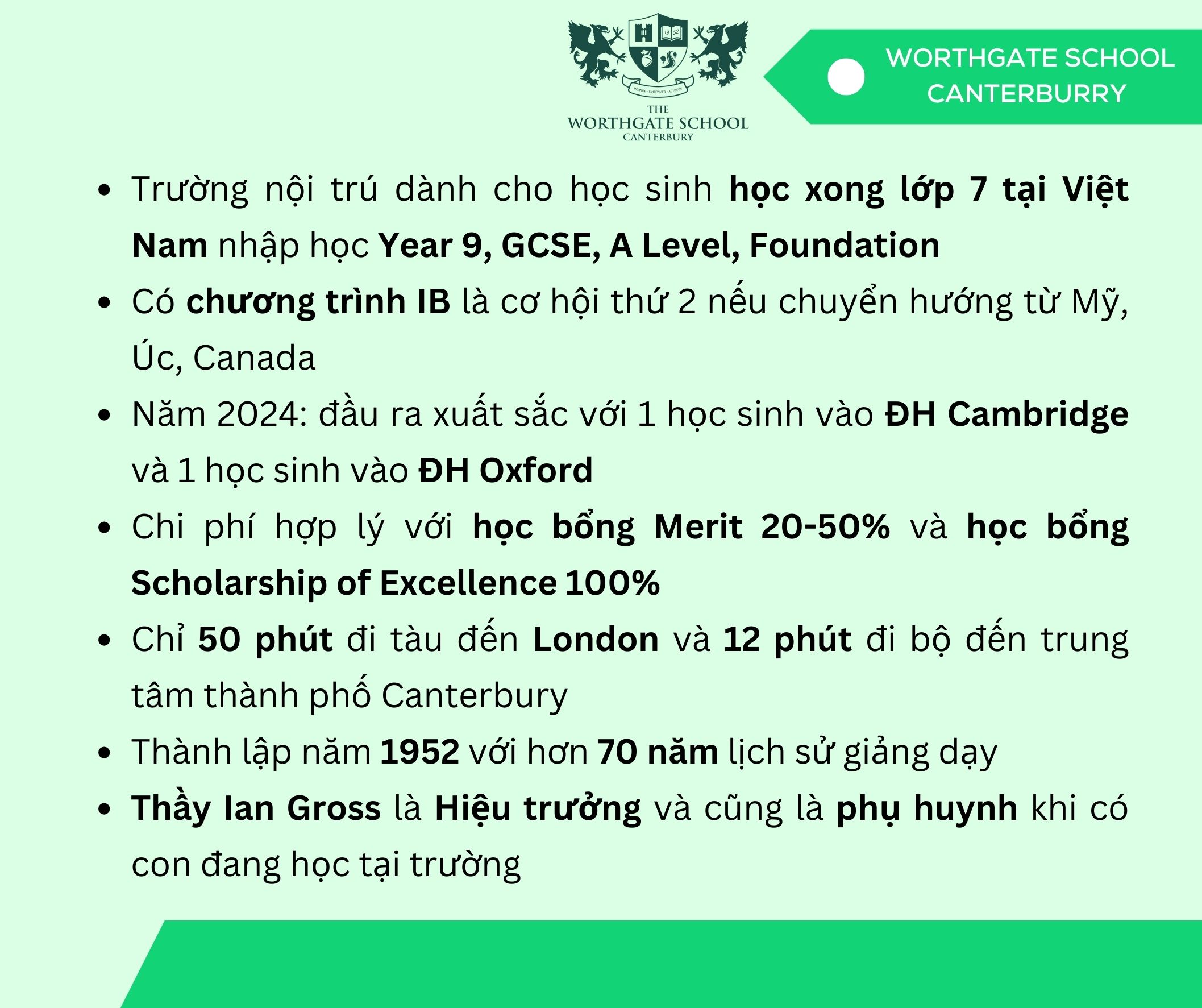 Worthgate School Canterbury là trường THPT nội trú tại Anh Quốc. Nhà trường đã và đang tạo ra những cơ hội học bổng đặc biệt cho các học sinh Việt Nam.